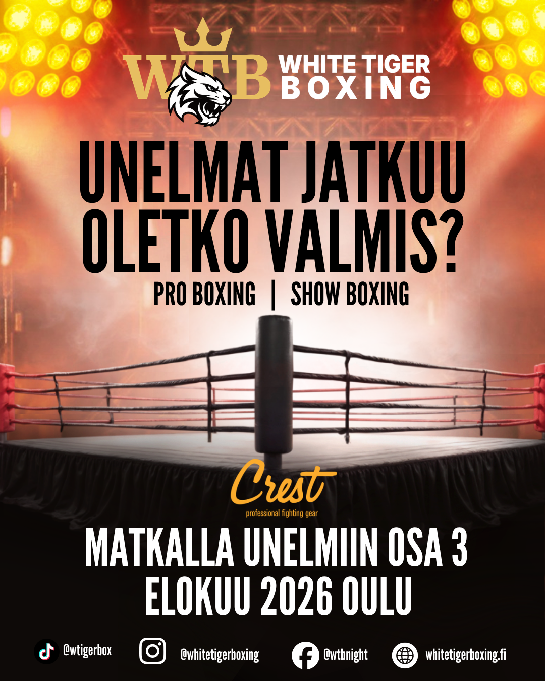 White Tiger Boxingin illassa 14.2.2026 Suomenmestaruus Ouluun! Illan pääottelussa Elias lunasti lupauksensa ja voitti ylemmän kevyt sarjan Suomenmestaruuden 6 erän keskeytyksellä! Tuomo Eronen antoi sitkeän ja kovan vastuksen, White Tiger Boxing toivottaa kaikkea hyvää Tuomolle jatkoon. Kiitos kaikille ketkä olitte mukana/paikanpäällä/striimin ääressä.