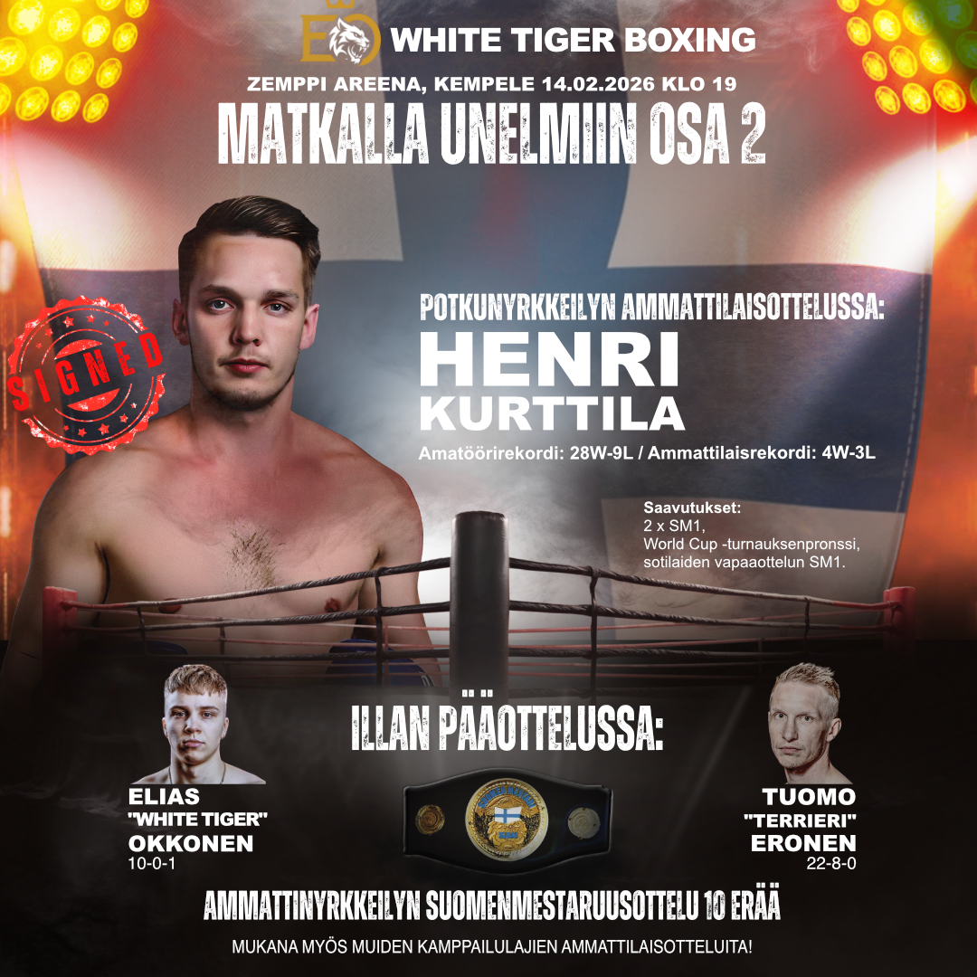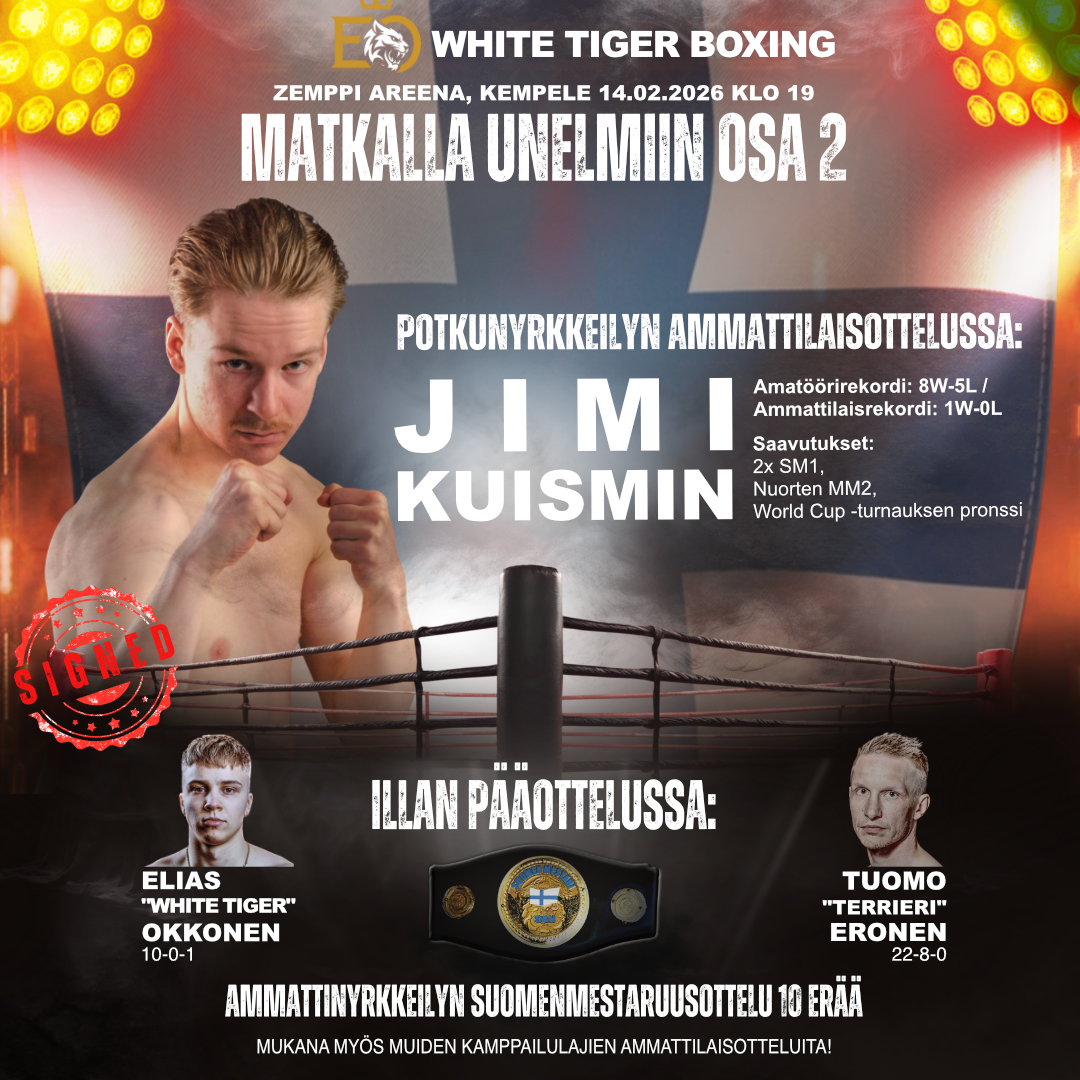 White Tiger Boxing tuo ystävänpäivänä 14.2.2026 Kempeleen Zemppi Areenalle odotetun kamppailulajitapahtuman, jossa nähdään Suomen ammattinyrkkeilyn huiput ja potkunyrkkeilyn huippunimet ammattilaisotteluissa. Illan kruunaa ylemmän kevytsarjan SM-titteliottelu, jossa vastakkain asettuvat Elias "White Tiger" Okkonen ja Tuomo "Terrieri" Eronen – kaksi eri sukupolven huippua, joilla on yhteinen tavoite: Suomen mestaruus.